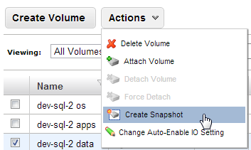 Select Snapshots in the left-hand menu in the EC2 Management Console. Search for the name of the snapshot you created in the previous step. Select the snapshot and click on the “Create Volume” button. This pops up the “Create Volume” dialog.