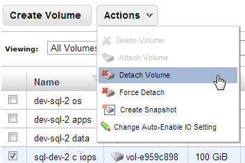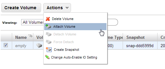 Select Volumes in the left-hand menu in the EC2 Management Console. Select your new volume, pull down the Action menu and select “Attach Volume” to bring up the “Attach Volume” dialog.